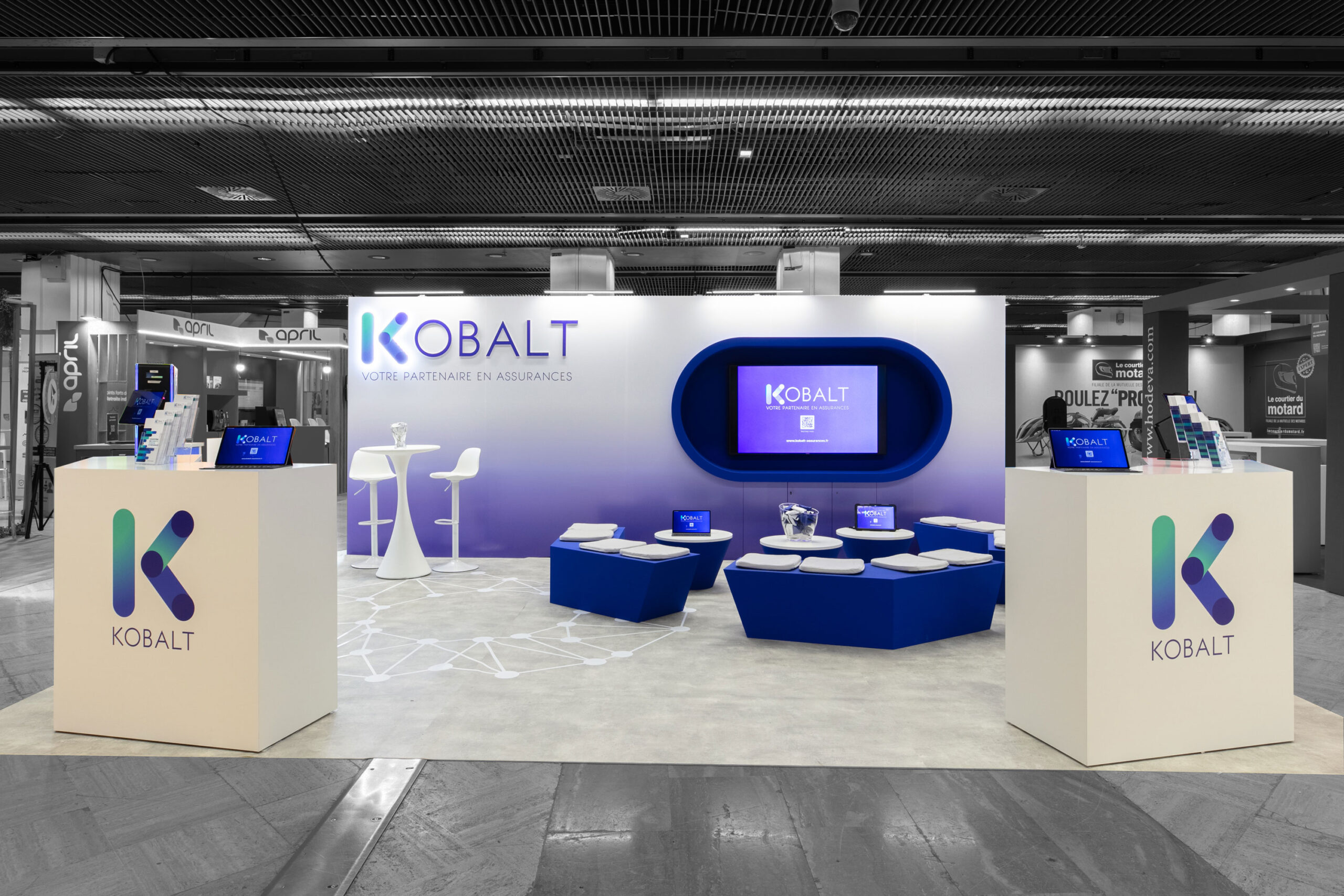 Vue de coté du stand sur-mesure Kobalt au salon JDC 2025.
